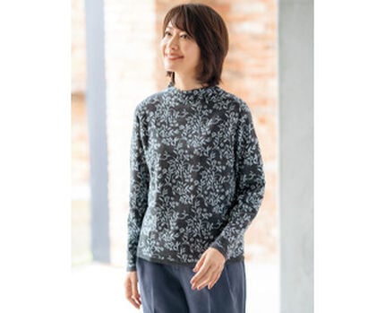 ダウンジャケットに草花柄のセーターで華やぎを取り入れて大人の冬を演出
