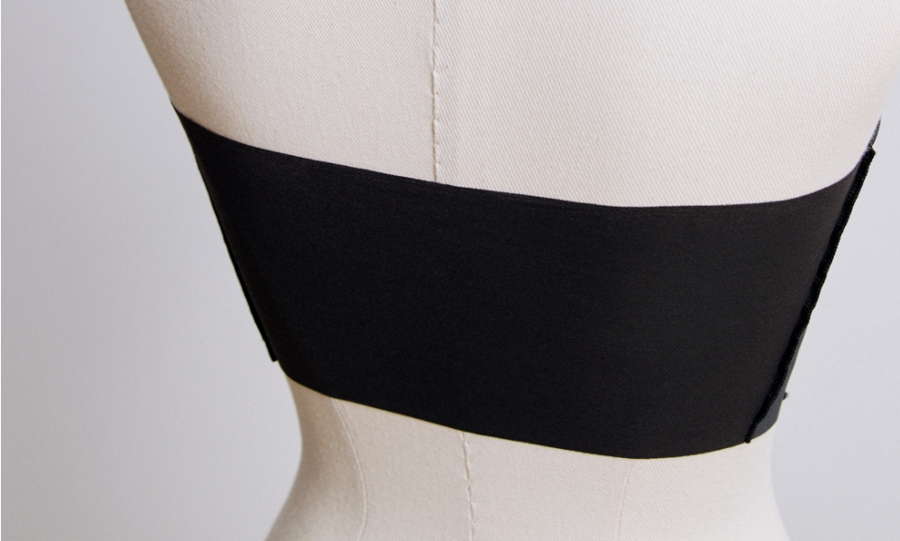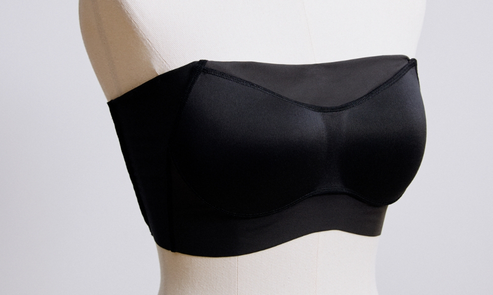 バスト周りや背中部分に、ポリウレタン混生地を使用。伸び感のある生地がからだにフィット。アンダーゴム不使用なのにズレ上がりにくく、バック部分はフリーカッティング仕様で背中の段差を軽減。