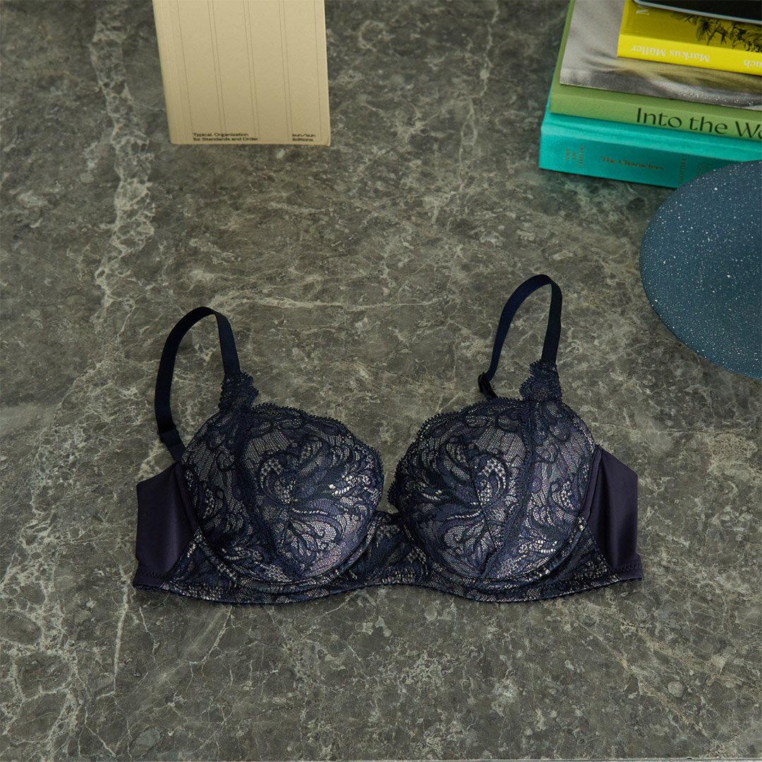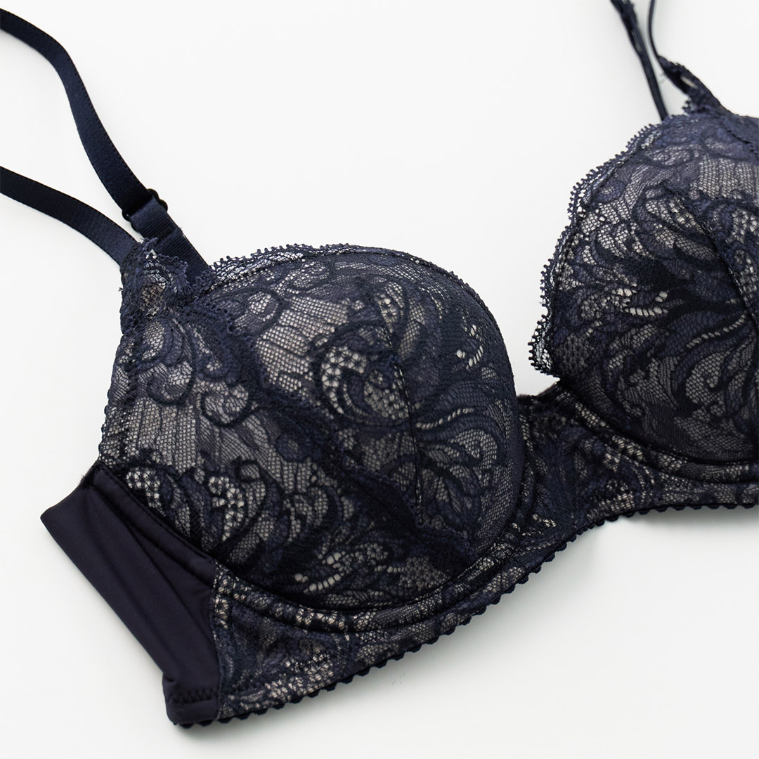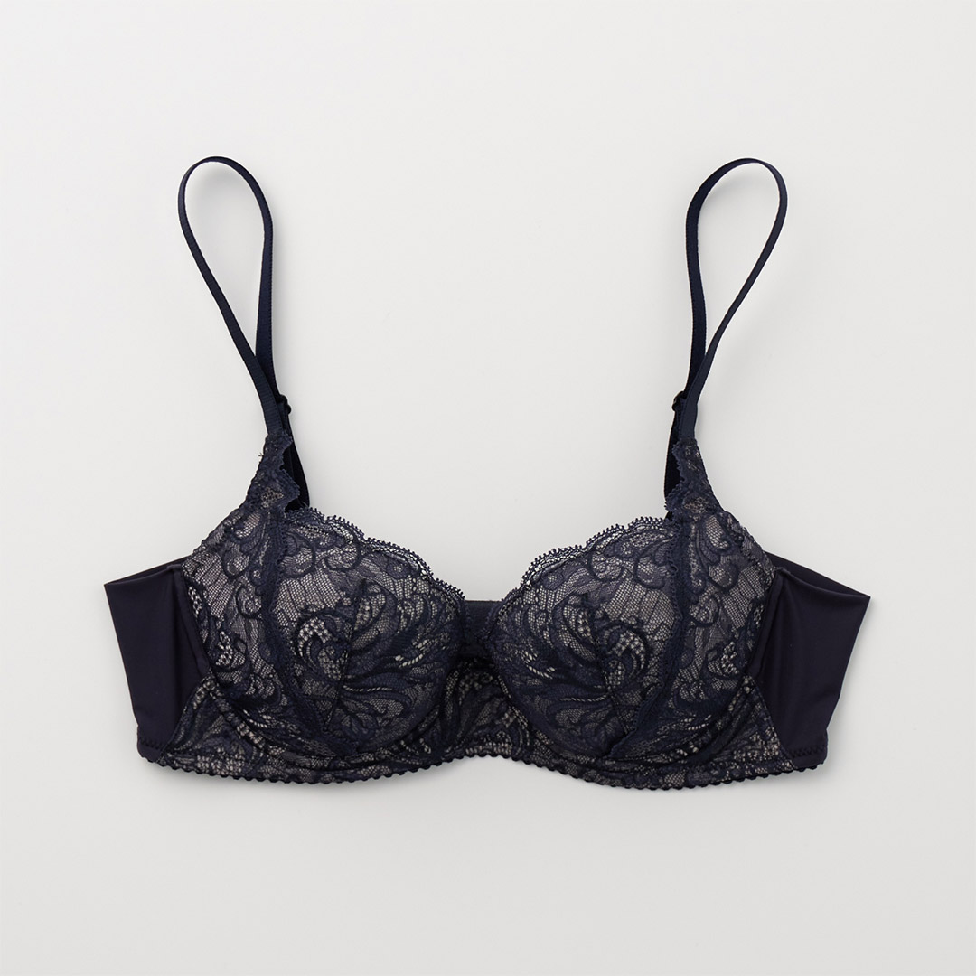 3/4カップでも浅めなので、バストの丸みに添いやすい!ピタッとパッドも入ってるので、カップとバストのフィット感を高めてくれますっ!さらにカップ肌側は綿混素材でやさしい肌ざわり♪またバック上辺折り返し始末になっているので、気になる背中の段差もスムージングしてくれますよー!!アウターにもひびきにくくなるのも嬉しいところ♡