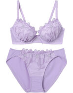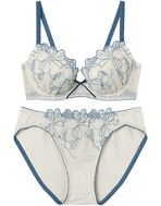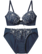 ラメ糸を使用した大花モチーフのエンブロイダリーレースで華やかな印象の、まる胸メイクのブラ&ショーツセット。
