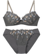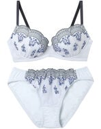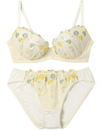 カラフルで形の異なる花のモチーフを散りばめたエンブロイダリーレースが印象的な、ブラ&ショーツセット。