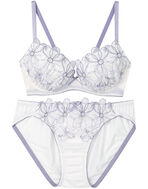 ラメ糸を使用した大花モチーフのエンブロイダリーレースが華やかなブラ&ショーツセット。