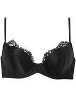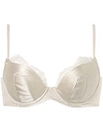 リバーレースとシルクのコンビネーションが魅力。バストをナチュラルに持ち上げてふっくらとした谷間をメイクします。ワイヤーはバージスライン(バストの底辺)に沿いやすい設計。カップはシルク混素材のシンプルなデザインでひびきにくく、カップ上辺にあしらった繊細なリバーレースとのコントラストがエレガントなデザイン。シンプルでありながら大人の気品を纏った、「Yue」が提案するリッチなスタイルを楽しんで。