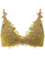 素肌がのぞく透け感が美しいセンシュアルなデザイン。生命力溢れる個性的な美しさを描いた唐草文様のリバーレースに、草花の生き生きとした動きを表現した立体感のあるケミカルアップリケを合わせました。胸もとの深いV字カットラインに繊細なサテンテープをクロスさせ、可憐な印象に。表情豊かで繊細なモチーフが重なり合う華やかな胸もとが、ラグジュアリーな魅力を引き立てます。