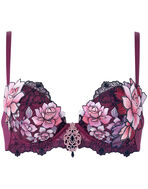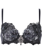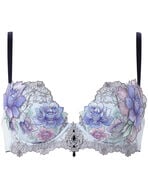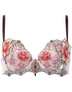 しなやかな曲線と美しい色彩の調和がエレガント。左カップにあしらわれた存在感のあるアップリケには、雫のようにきらめくスワロフスキー・クリスタルを飾りました。繊細なグラデーションで彩られた2つの大胆なバラが、オリエンタルなムードが漂うレースの魅力を引き立てます。前中心のクラシカルなモチーフは上品なアクセントに。統一感のあるカラーリングで、洗練された美しさを表現しました。