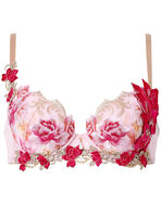流れるようにしなやかな線が優雅なシリーズ。額縁をモチーフにした曲線が豊かな色彩の花々を引き立て、まるで絵画を見ているような気分に。神秘的な美しさをもつアルバローズをイメージしたアップリケにはきらめくクリスタルをあしらいました。前中心の上品なパールビーズのチャームがワンポイント。心華やぐ鮮やかなカラーが日々に彩りを添えます。