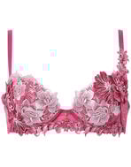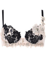 はっきりとした輪郭で表現された花々と、芍薬の花をイメージしたアップリケがゴージャス。ドラマティックなカラーリングが魅力を引き立たせます。花びらの上にあしらわれたクリスタルと、前中心で優雅に揺れるチャームの輝きがアクセント。ストラップ片側と土台下辺には艶やかなケミカルアップリケをほどこし、洗練されたデザインに仕上げました。