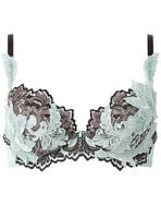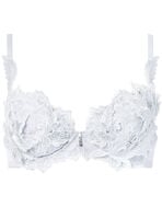 古代ギリシアの建築にインスパイアされたデザインのレースと、アカンサス文様をあしらったバラのアップリケがラグジュアリー。花びらにはキラキラと輝くスワロフスキー・クリスタルを飾りました。左右のストラップにほどこされた2枚の羽根モチーフがアクセント。あえてシンプルなカラーリングにすることで洗練された美しさを表現しました。ディテールにこだわった特別感のあるシリーズ。