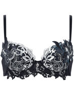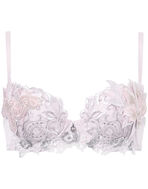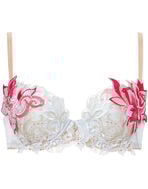 多くの歴史や芸術が息づく博物館のように美しい都市、ローマの魅力を表現。ローマ建築特有のアーチやドーム、柱の装飾からインスピレーションを受けた繊細なレースを飾って神秘的な仕上がりに。グロリア・デ・ローマというバラの花をクラシカルにアレンジし、アップリケとして大胆にあしらいました。胸もとで輝くチャームジュエリーは、皇帝へ贈られたきらびやかな宝飾品がモチーフ。勇敢な兵士たちの羽飾りを表現したサブアップリケは、このブラジャーだけに飾りました。ロマンティックな色合いが、タイムスリップしたような気分へと誘います。