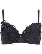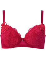彫刻のように立体的なレースが美しさを演出。シンプルなカラーリングがひとつひとつのパーツを引き立てます。バラの花をイメージした存在感のある左カップのアップリケには、きらめくスワロフスキー・クリスタルをあしらいました。前中心のクリスタルチャームがゴージャスなアクセントに。ホリデーシーズンにぴったりなカラーをまとって特別なひとときを。