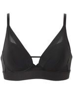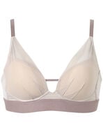 「重力ケアブラ ノンワイヤー」のシンプルタイプ。しっかりホールド感があるのに、解放感のあるラクなつけごこちが魅力です。モールドカップが自然なまるみをメイクし、機能性と使いやすさを兼ね備えています。アンダーのゴムを太めにすることで下着っぽさを感じさせないカジュアルな印象に。透け感のあるパワーネットを使用し、トレンド感のあるデザインに仕上げました。カップのパワーネットはレーシィタイプと比べ低い位置に設計し、胸もとのあいたアウターからも見えにくくおすすめです。