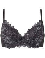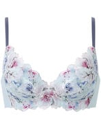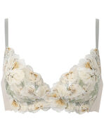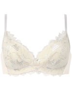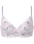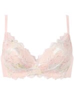 ノンワイヤーなのに、バストアップしてきれいなシルエットで人気の「SUHADA ONE」。ワイヤーブラは苦手、でもバストメイクはしたいという方におすすめです。プリズムの光をイメージした花を、レースにプリントを重ねて幻想的に表現。大きな花が存在感を放つエレガントなデザインです。レースはカラーによって選べる3タイプのプリントを展開。