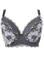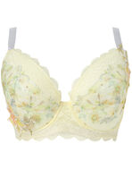 下カップのレースには繊細に輝くラメ糸を散りばめ、カップサイドに大きなアップリケを大胆にあしらったデザイン。アップリケは透け感があり、軽やかで春らしい印象です。