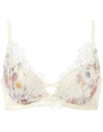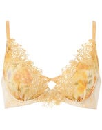 カップにほどこされたレトロポップな花柄のケミカルレースが贅沢なデザイン。繊細な細番手の糸を使ったインケミカルレースが透明感を演出します。土台はケミカルアップリケとラッセルレースを組み合わせて、モダンでかわいらしさもある仕上がりに。WH・YEカラーにはプリントをあしらい、華やかさを一層引き立てました。細やかで美しいレースに心躍る一枚。ノンワイヤーでカジュアルに着用できるのもポイントです。