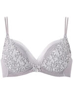 胸もとに使用した透け感のあるチュールが、軽やかなスタイルを叶えるブラジャー。カップにあしらった繊細なケミカルレースは、可憐な小花とリーフがモチーフ。やさしいタッチで描き、ノスタルジックな雰囲気に。立体感のあるケミカルレースとシアー素材のコントラストが引き立つ、ワントーンでまとめた上品なカラーリングもポイントです。