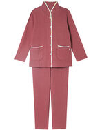・明るくシックな無地パジャマに、軽やかな印象の花柄プリントのパイピングがポイント