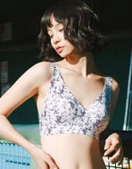 深い胸もとのVラインとバックスタイルで洋服との着合わせが楽しめるハーフトップ(ノンワイヤーブラジャー・ホックなし)。ネックラインや背中のあいた肌見せファッションを楽しみたいときにおすすめです。脇の段差になりやすい部分をカバーし、すっきりとした印象に。ねこ耳タイプのピーナッツ型パッドが上向きで立体的なバストラインを演出します。シンプルな無地から華やかなプリント柄まで多彩なカラーラインアップ。デイリー使いしやすく、カラー違いで持っていても便利なアイテムです。