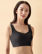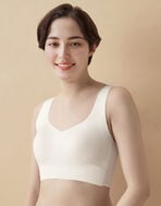 綿混素材を使用した肌ざわりがやさしいラウンドタイプのハーフトップ(ノンワイヤーブラジャー・ホックなし)。伸びがよくしなやかな風合いでバストをふんわり包みこみます。ピーナッツ型パッドが内蔵されているので上向きで立体的なバストラインを演出。なめらかな肌あたりのフリーカッティング素材で、洋服にひびきにくくすっきりとしたシルエットに仕上げました。カラーはデイリー使いしやすいラインアップ。おうち時間からお出かけまで、日常に寄り添うベーシックアイテムです。