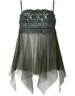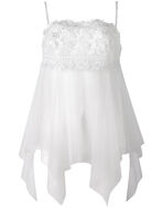 ランダムに重なり合うチュールが美しい、イレギュラーヘムキャミソール。整然としたステッチを効果的に使い、刺繍糸の光沢を生かしてパールの輝きを表現。伸びやかな植物モチーフを上品なきらめきで華やかに彩りました。上品な透け感があるボリューミィなスカート部分は、まるでドレスを着ているような気分に。シンプルとラグジュアリーの調和に心が躍る、ホリデーシーズンにぴったりの一枚です。