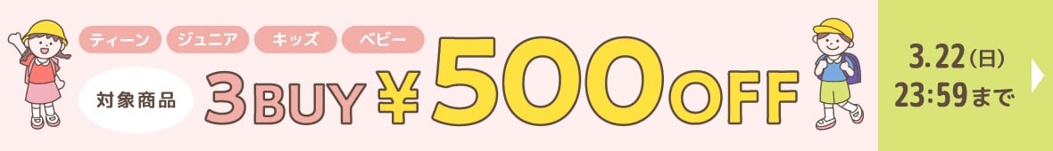 3/22(日)23:59まで★キッズ・ジュニア・ティーン・ベビー商品3点以上で500円オフキャンペーン!