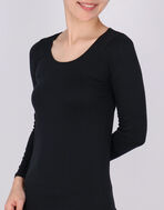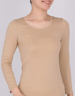 ふんわりとしたやわらかな風合いと、包みこんでくれるようなあたたかさが魅力のインナー。腕をあたたかく包みこむ8分袖で、袖口からは見えにくい絶妙な丈感。ネック浅めで、デコルテ部分も広範囲にカバーします。すっきりと着こなせるため、重ね着コーディネイトのインナーとしても便利。着ぶくれしたくないけどあたたかく過ごしたいという方におすすめです。吸放湿性があるので意外と気になる冬のムレ対策にも。