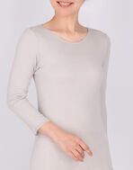 まるで空気をまとっているかのように軽やかであたたかいインナー。しっとりやわらかな風合いでここちよい着用感です。身生地はオーガニックコットン100%でやさしい肌あたり。秋冬ファッションの袖口から見えにくく、さまざまな着こなしと合わせやすい8分袖タイプです。襟あきが浅めなのでデコルテをしっかりカバーしてあたたかい。脇マチ付きで動きやすくしました。素材を生かしたシンプルなデザインでプレゼントにもおすすめです。