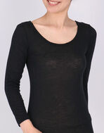 なめらかな風合いが特徴のマイクロモダールと、上質でやわらかなホワイトカシミヤを使用したローゲージのガーゼ調ベア天竺素材で、薄くて伸びがよくあたたかく、着ぶくれしにくい