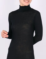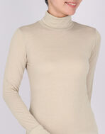 なめらかな風合いが特徴のマイクロモダールと、上質でやわらかなホワイトカシミヤを使用したローゲージのガーゼ調ベア天竺素材で、薄くて伸びがよくあたたかく、着ぶくれしにくい