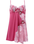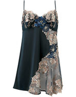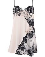 雰囲気の異なる2つの素材を大胆に切り替えた、斬新でゴージャスなロングキャミソール。はっきりとした輪郭で表現された花々が独創的な魅力を際立たせます。芍薬の花をイメージした胸もとのアップリケにクリスタルを添えて特別感を演出。バックスタイルは背中を美しく魅せるセクシーなデザインに仕上げました。
