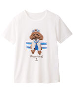 セーラー服を着て航海士になりきっている犬とマリンモチーフをちりばめたさわやかなプリント柄(TUカラー)