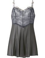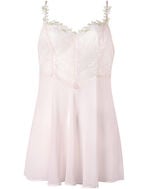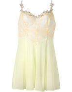 フロントにはやさしくやわらかなレースを用いて、フロント上辺からストラップにかけてレースを沿わせたかわいらしいデザイン。バックスタイルはラメ糸を散りばめたレースとアップリケをあしらって豪華に仕上げました。ブラジャーとコーディネイトしても、キャミソール単体でも楽しむことができる一枚です。