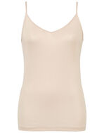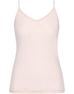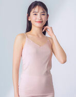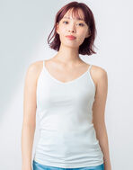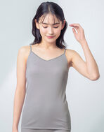汗やムレが気になる季節も、肌に一枚重ねるだけで軽やかなやさしさに包まれる機能性インナー。薄手で軽く伸びやかなオーガニックコットン混素材を使用。天然素材ならではのやさしい肌ざわりを生かしながら、古着や裁断くずを再生したリサイクルポリエステルを使用し、薄く軽く伸びのよい着ごこちに。生地の編み目を旧品番のものより細かく改良しました。吸汗速乾性や通気性がよく、さらに抗菌防臭機能をプラスして快適性を追求。アウターになじみのよいカラーと、襟ぐりの細ステッチ仕上げは下着感が少なく、首もとからチラリと見えてもOK。ストラップは長さ調整も可能。軽やかでやさしい肌ざわりをぜひ体感してください。