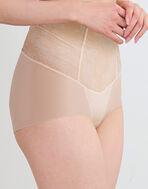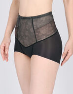はきこみ丈を通常のジャストウエストより高めの丈にすることで、おなか・ヒップのリフトアップ効果を高め、よりスリムなシルエットを追求。さらにヒップ下はパワー切り替えのない素材で、たるみをぴったり包み、美しいシルエットをキープ