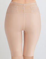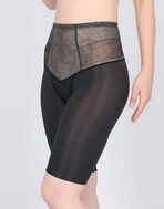はきこみ丈を通常のジャストウエストより高めの丈にすることで、ふとももからおなか、ふとももからヒップのリフトアップ効果を高め、よりスリムなシルエットを追求。さらにヒップ下はパワー切り替えのない素材で、たるみをぴったり包み、美しいシルエットをキープ
