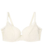 広めのワイヤーがバストをしっかり収めて、バストボリュームをささえることでデコルテふっくら。