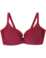 広めのワイヤーがバストをしっかり収めて、バストボリュームをささえることでデコルテふっくら。