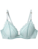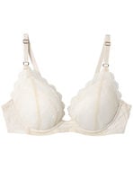 ・カップレースの引き上げ構造でバストになじみやすく、ナチュラルなシルエットでキレイに包みこむ。