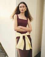 シャツやジャケットのインナーとして合わせてもすっきり着こなせるスクエアネック。