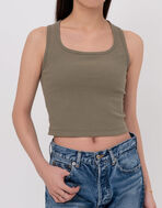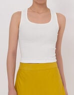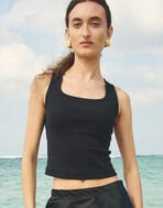 絶妙な丈感とカットラインがアクセントになった、ワードローブに1枚追加したいカップ付きタンクトップ。