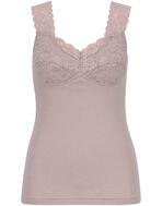 肩にあしらったレースの肌側にはやわらかいウーリー糸を使用することでザラつきを感じにくい