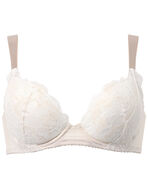 もちっとふんわり触感としっとりすべすべな肌ざわりがクセになる一枚。ここちよさのヒミツは“ふわぴたパッド”とパッド受け素材。肌なじみのいい素材がバストにフィットして、とろけるような着用感です。ストラップは幅広タイプなので、ズレ落ちや肩へのくいこみが気になる方におすすめ。こだわりの素材からデザインまで、やさしいつけごこちをとことん追求したブラジャーです。