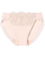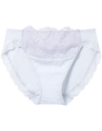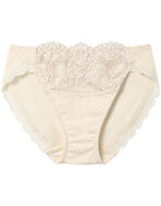ナチュラルアップブラ(KB3000)シリーズとのペアコーデが楽しめるショーツ。身生地部にはフィット性がよくソフトな風合いの素材を、ウエストと前裾には伸びのよいテープを使い、やさしいフィット感に仕上げました。バック裾には繊細なストレッチレースを使い、アウターにひびきにくい仕様に。