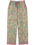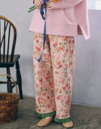 ・裾のフリルやリボンに効かせた無地のアクセントカラーがポイントのワイドパンツ
