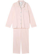 毛羽立ちが少なく、なめらかな肌触りの綿混の開襟シャツの長袖パジャマ。