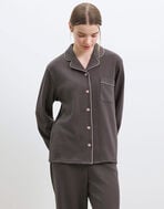 綿混のソフトな風合いのリブ素材を使用した長袖の開襟パジャマ。