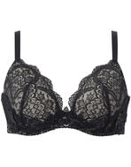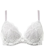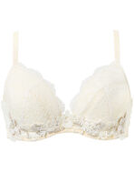 ●ヨーロッパの宮殿のバルコニーやドームのアーチを連想させる柄の編みレースの上に、宮殿の装飾のようなクラシカルで繊細な幾何学模様調のモチーフをケミカルアップリケで表現し、大切なバストをそっと包みこむように上品にあしらったデザイン