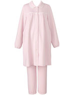・ニットキルトにシンプルな水玉をプリントし、襟、ヨーク切り替えにレースをつけポイントにしました。
