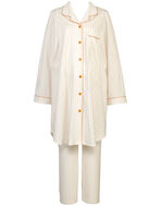 ●ボトムはマタニティ用の設計でおなかをすっぽり包みこみ、ウエストも高伸度ゴムの使用でラクなはきごこち(ウエストゴム取り替え口あり)