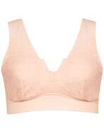 横向きで寝ることが多いマタニティのバストをやさしくささえるために、カップ肌側布の前中心を高めにした、昼間用のハーフトップとは異なる設計で、就寝中の脇流れを軽減