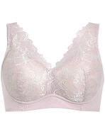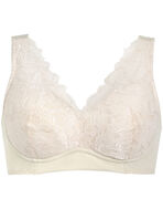 ネックとアームホールが広げやすく、足からはいても頭からかぶってもスムーズに着脱ができるノンワイヤーブラ。着脱時に裾がまるまりにくく、巻き上がりづらいのもポイント。「かぶりのノンワイヤーをもっとラクに着脱したい」という方にもおすすめです。ソフトな肌あたりで、ストラップ裏の引き上げ構造がほどよくバストをサポートするので、ラクに美しくフィット。バック上辺はフリーカッティングでアウターにひびきにくい仕様に。エレガントで抜け感のあるレースが特徴で、クラシカルでありながらモダンな雰囲気に仕上げました。